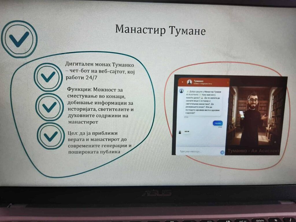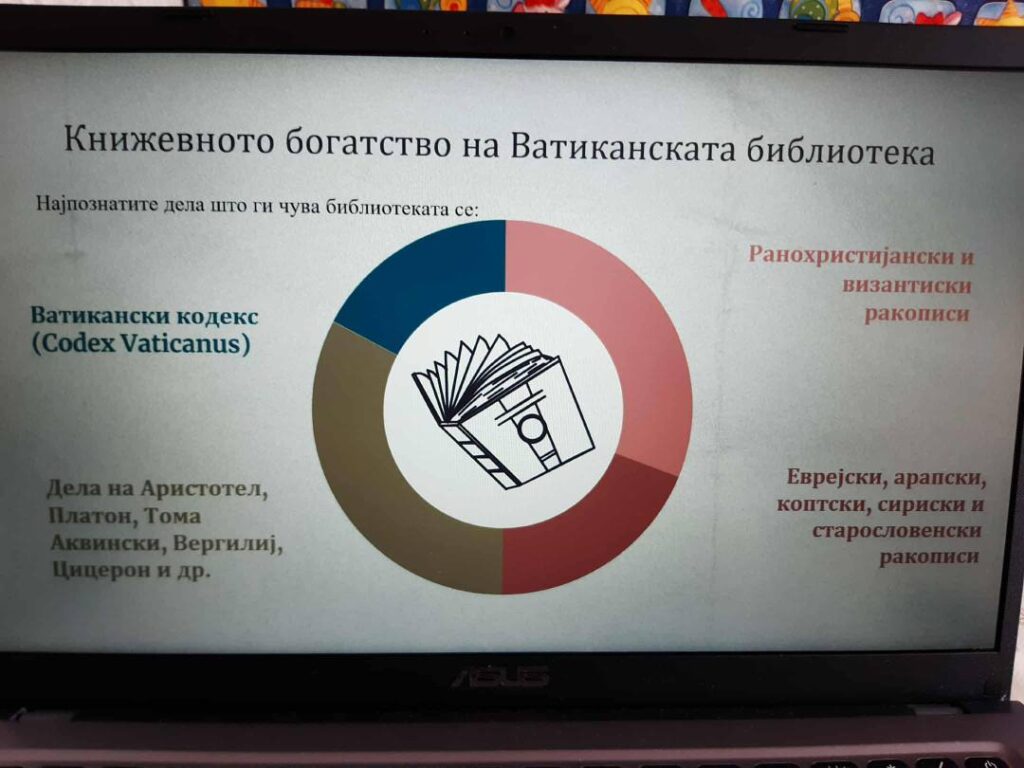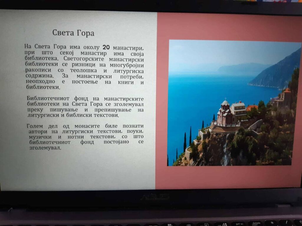Учениците имаа ваква тема за обработа како наставна единица и денес имаа можност преку истражувањето на докторанд Елена Станкоска, виш библиотекар, да се запознаат со богатото културно и духовно наследство што го чуваат манастирските библиотеки и нивната улога во зачувувањето на писменоста и традицијата, и манастирските библиотеки во дигиталниот свет.