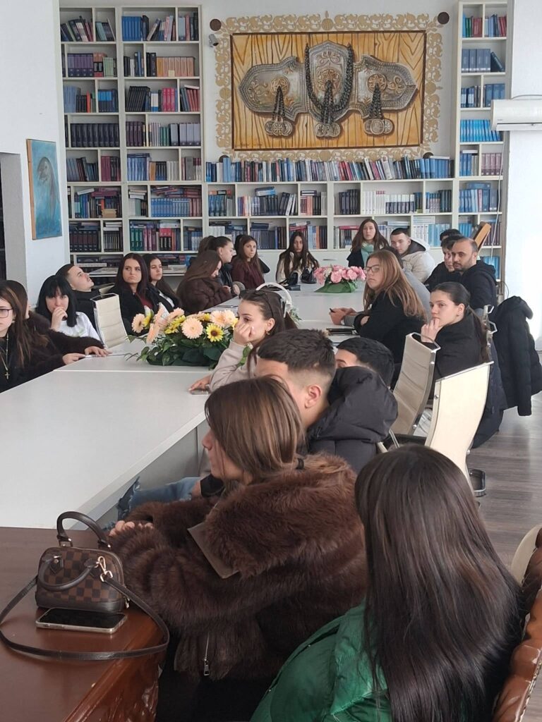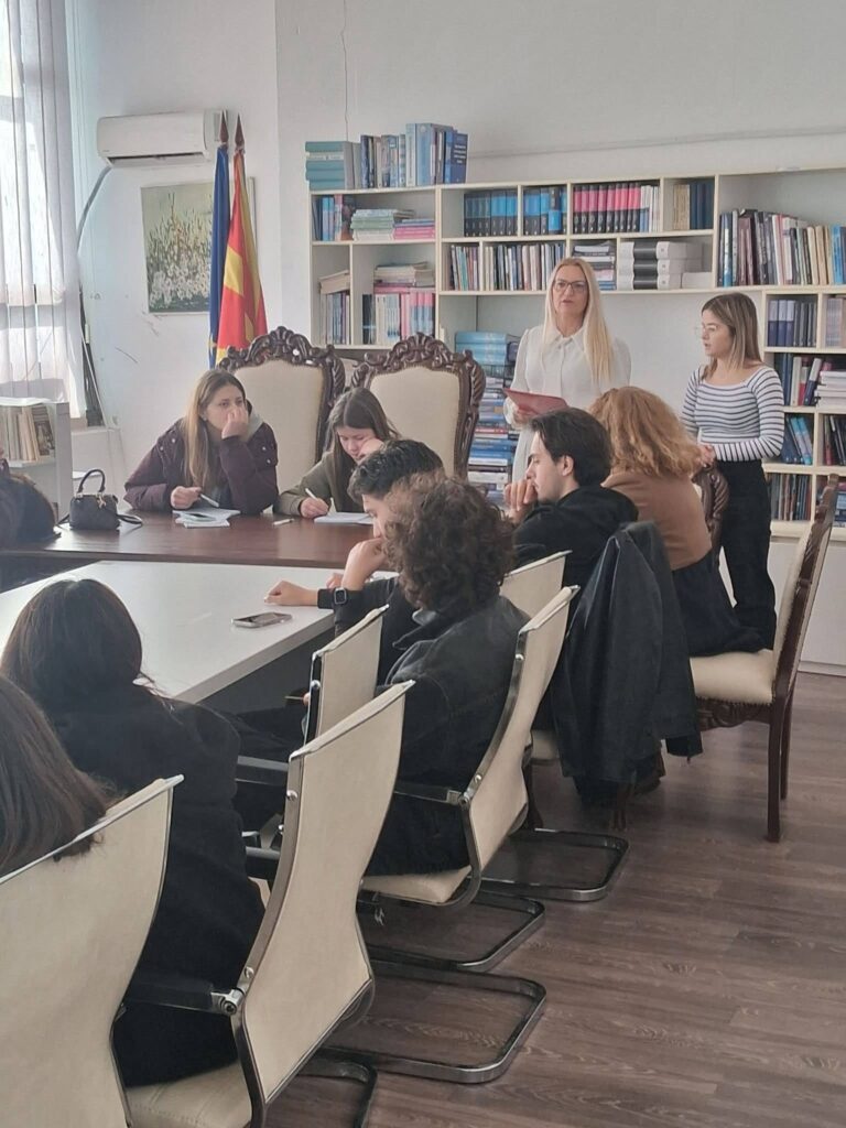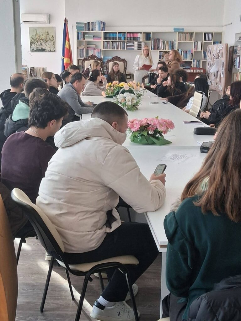Учениците со професорките Даниела Мијалчова и Дијана Цонева беа во посета на библиотеката, каде беа споделени повеќе информации за размената, за нашите роднокрајни автори, нашата литература и работата на нашата библиотека. Учениците исто така,имаа можност да ја разгледаат англиската л и албанската литература со која располага библиотеката.